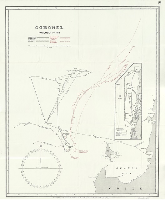 History of Sea Power, p 362![]() Gutenberg Battle of Coronel, A History of Sea Power, p 360 Please note charts 14 and 15 are originally from the portfolio Naval Operations Vol I (Maps) accompanying the first volume of History of the Great War based on official documents, by direction of the Historical section of the Committee of Imperial Defence Naval Operations: Vol 1, to the Battle of the Falklands, Sir Julian S Corbett, originally published by Longman, Greens and Co, London, 1920. |